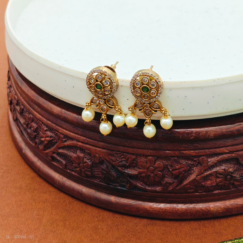 - These gold-plated stud features white stones with green stone centered in floral pattern in addition with pearl drop model , ideal for enhancing your look during any occasion.