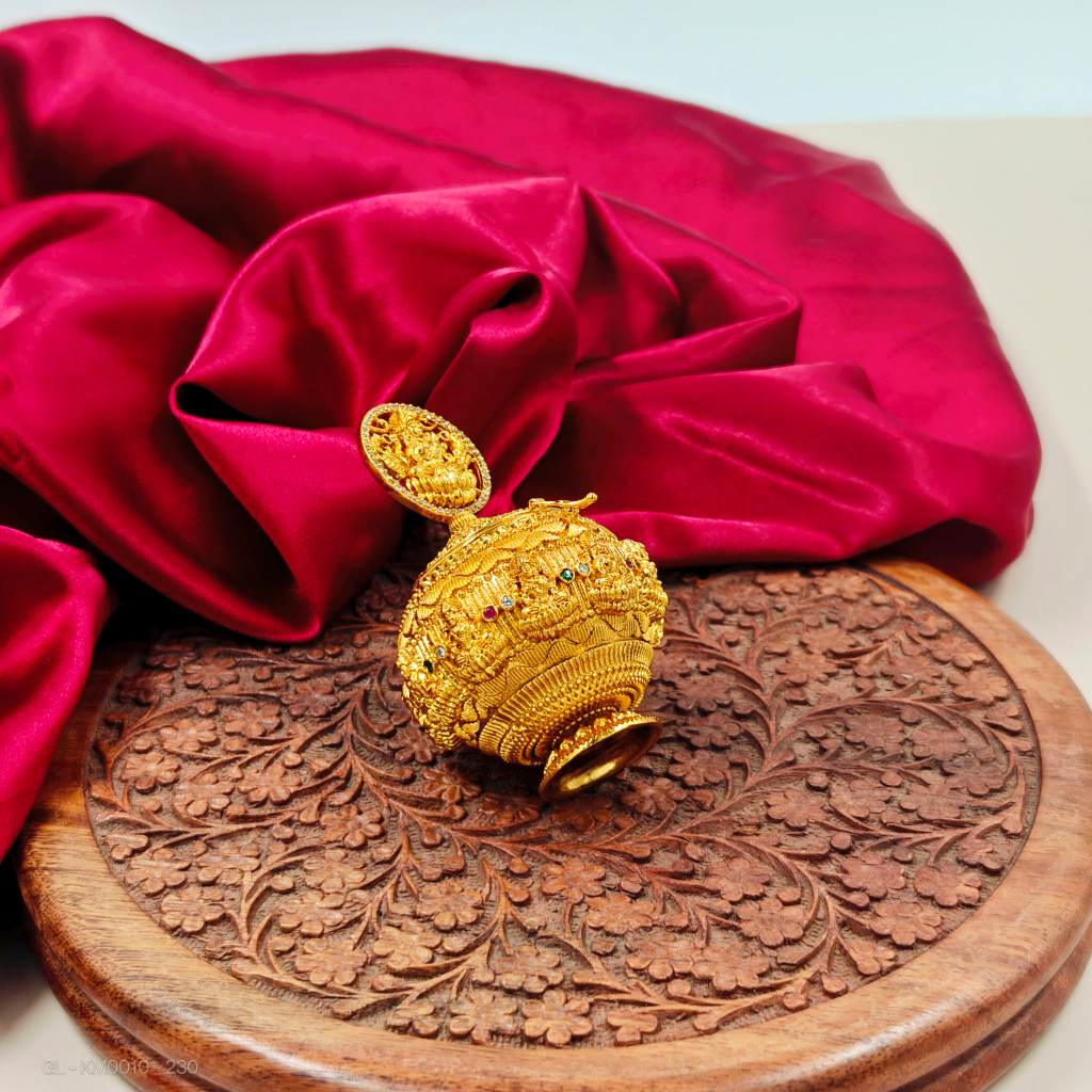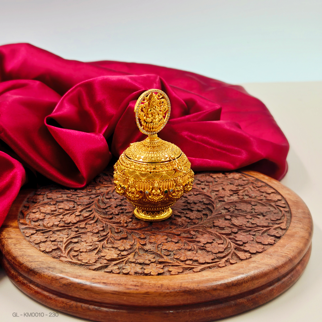 - This kumkum box has a gold-like finish with God Lakshmi and AD stones. Made from imitation materials, it offers a traditional temple style for storing kumkum.