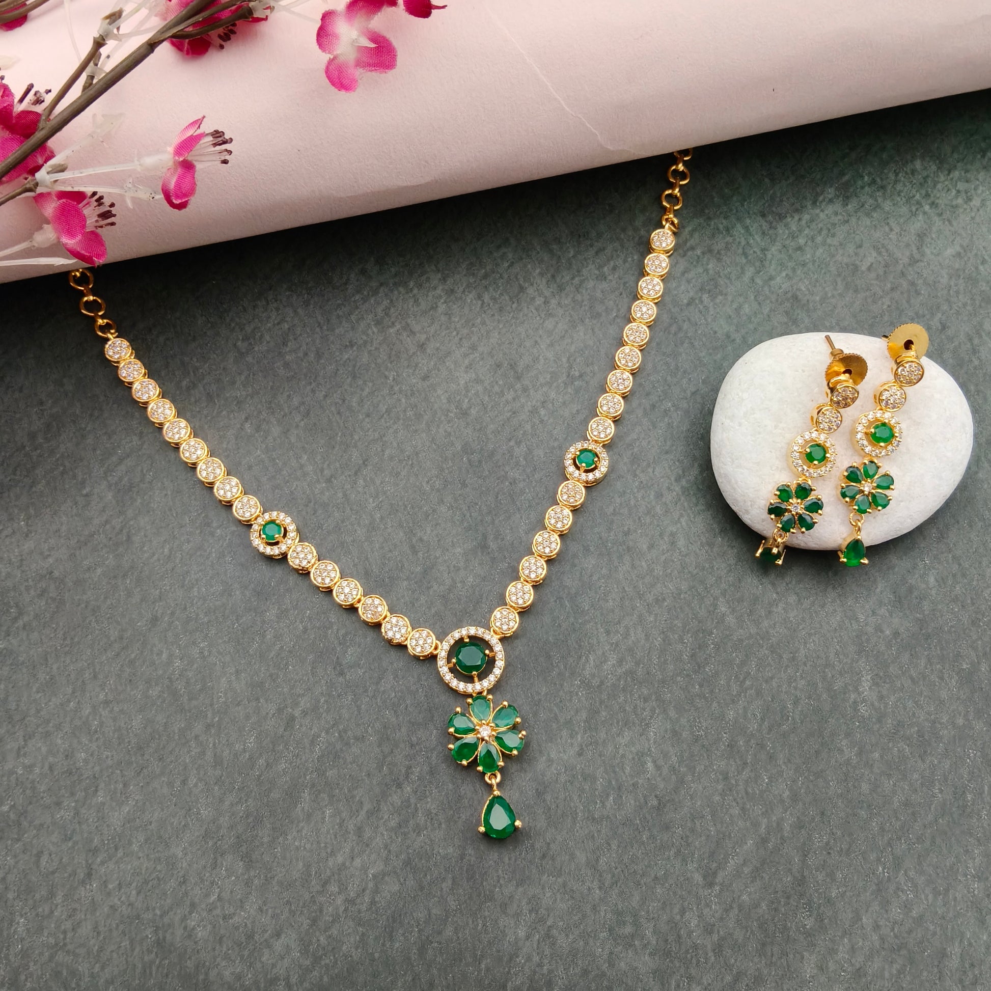 This necklace set features stunning gold plating and is adorned with American Diamond and Emerald stones, creating a truly elegant and luxurious piece.