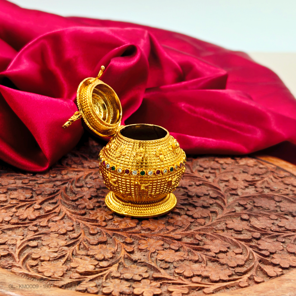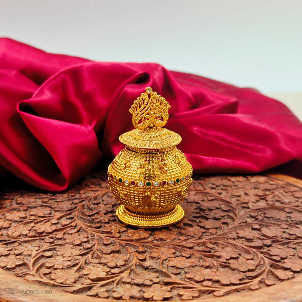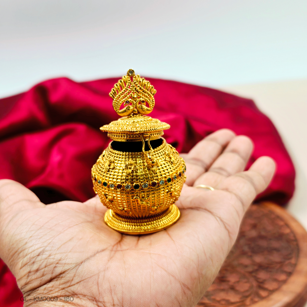 - This kumkum box has a gold-like finish with Peacock Design and AD stones. Made from imitation materials, it offers a traditional temple style for storing kumkum.