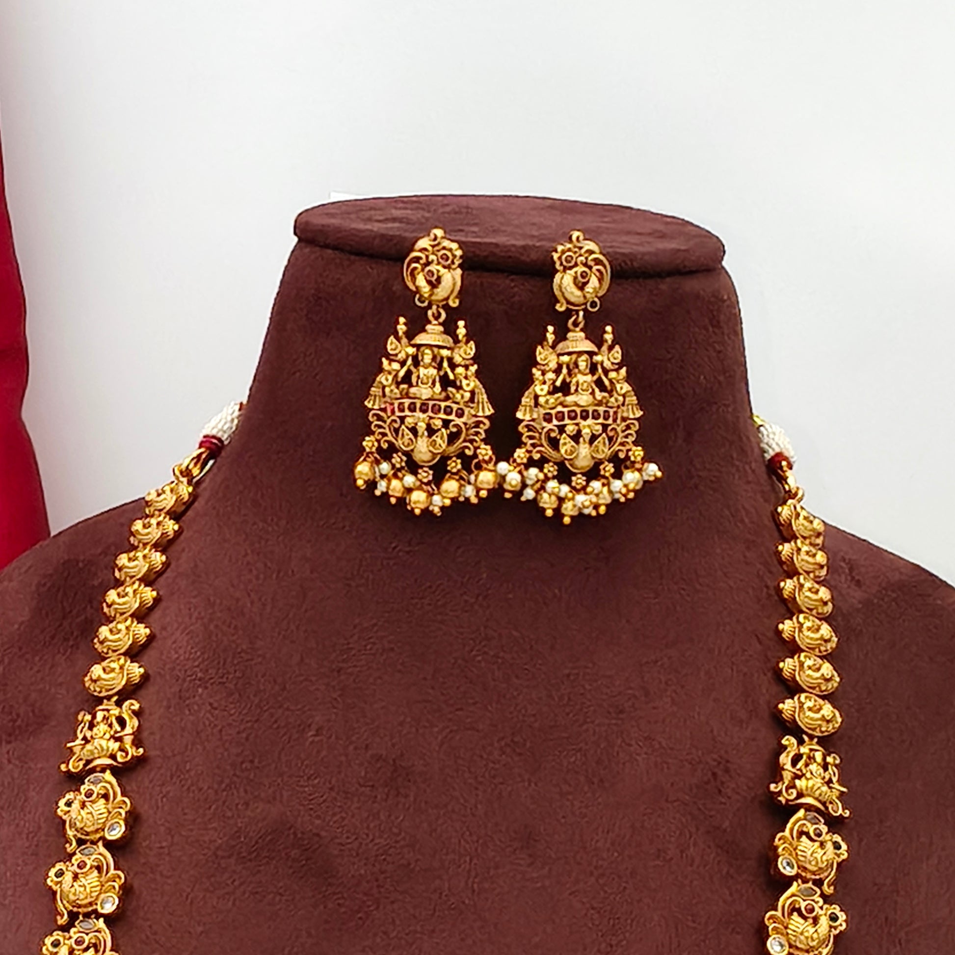 This Mid Length Lakshmi Necklace Set features a lightweight yet durable matt gold finish, complete with beautiful green beaded jhumkas for an elegant touch.