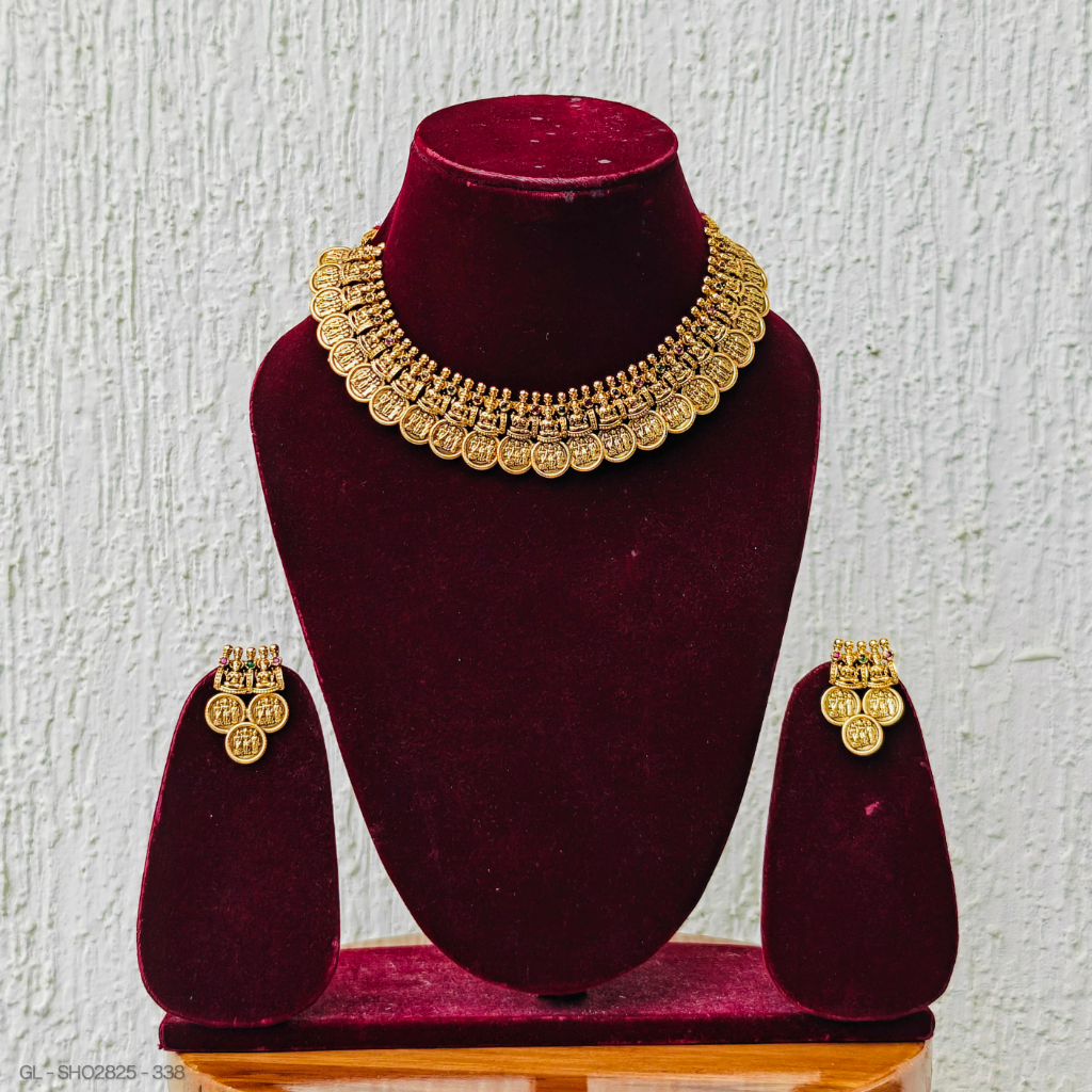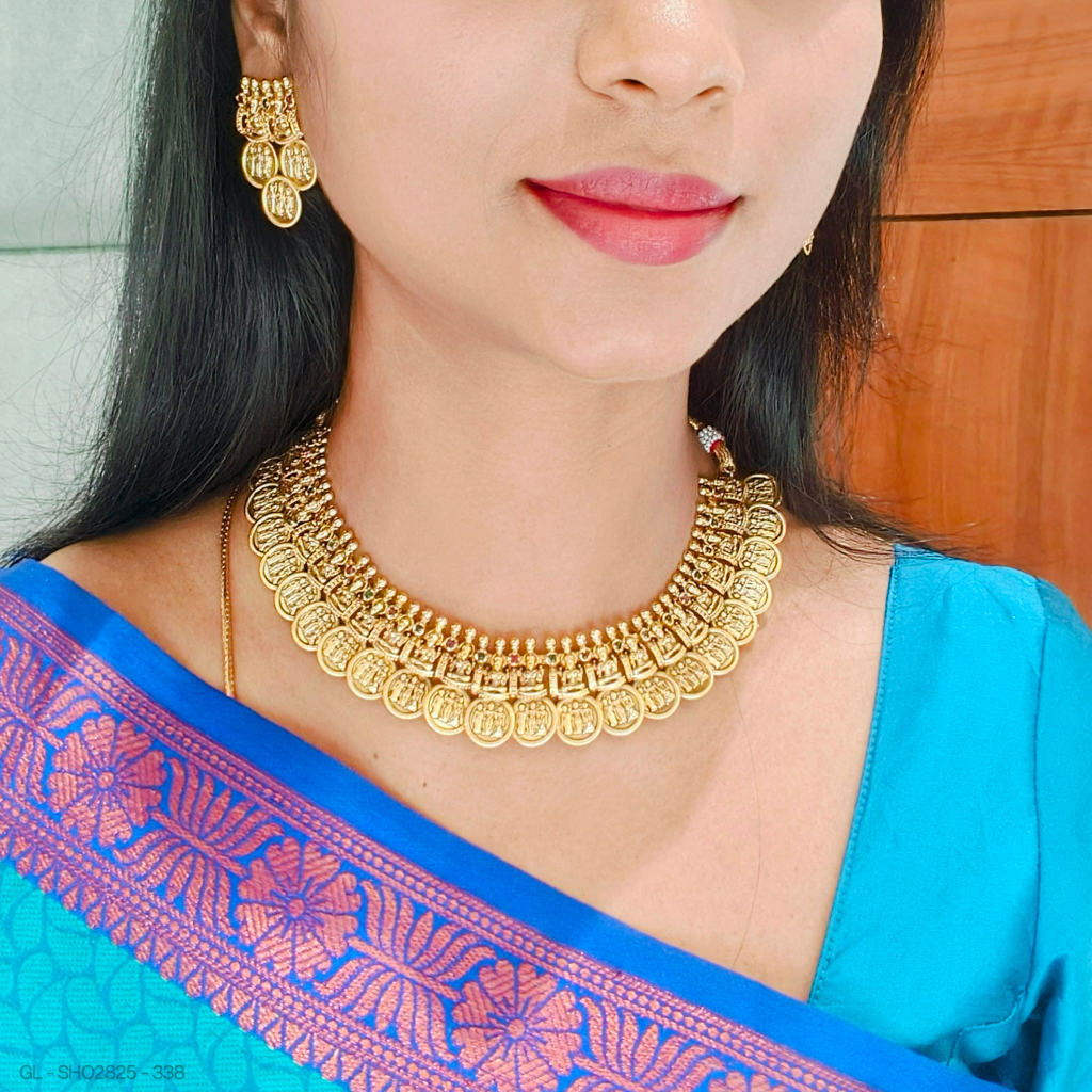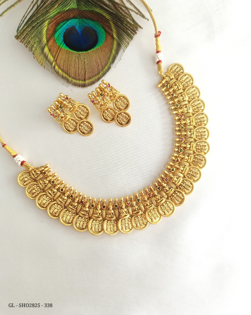 This Golden coin necklace boasts a vibrant Multicolor design with ruby and emerald stones, creating a stunning Lakshmi motif ensemble. The intricate Nakshi work adds even more elegance to the necklace's Gold finish.