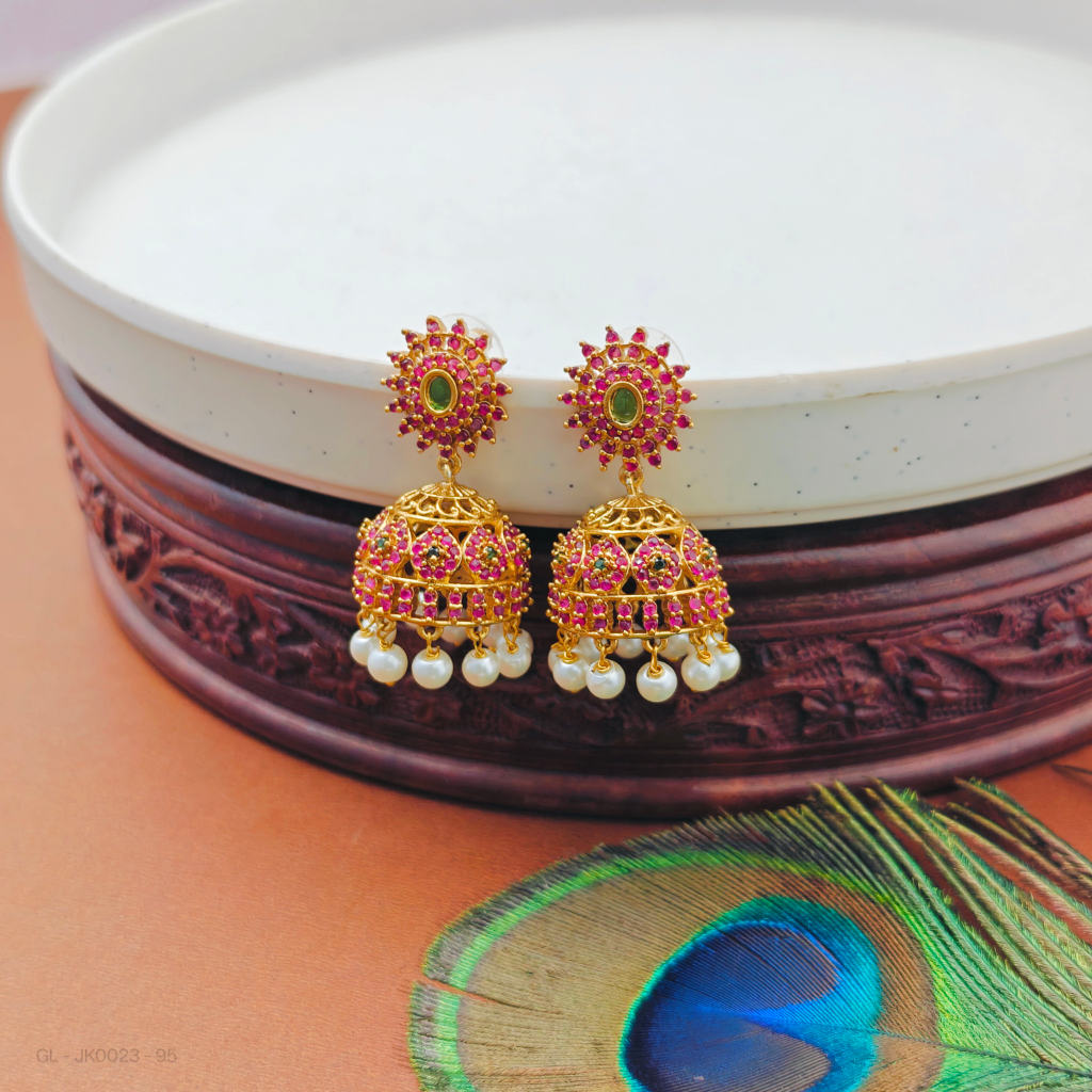 Golden Cz-Center Emerald-Ruby-Stones-pearl bottom- Jhumkis