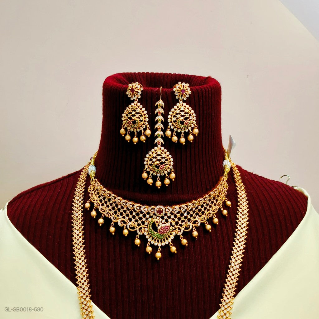 - This Cz Gold finish set features peacock design in Cz Ruby stones layered throughout, including a Short and Long Necklace, Earrings, and Nethichutti / Tikka.