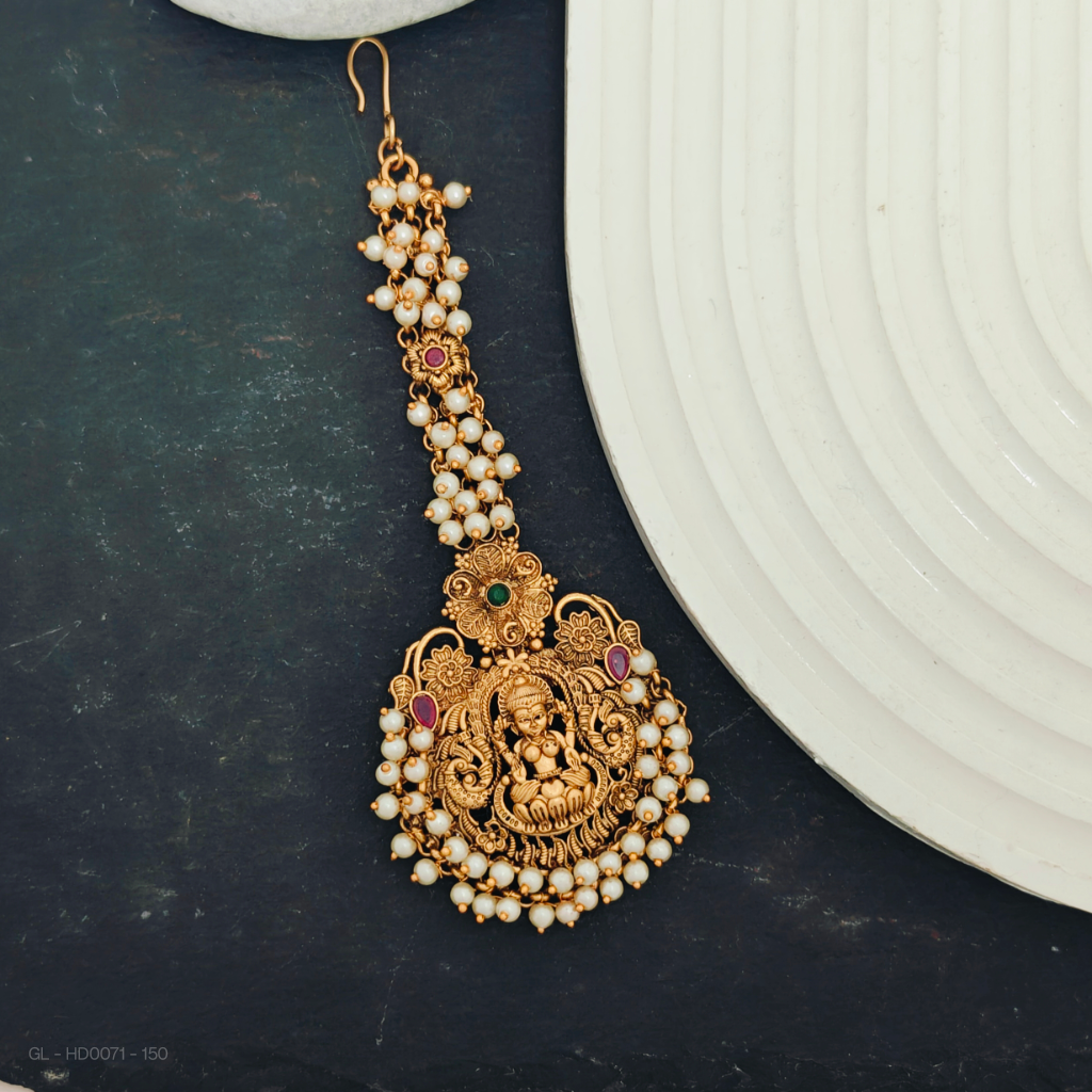 - The Lakshmi Tikka Head Accessory features a carefully crafted design, incorporating kemp stones, pearls, and a gold finish.