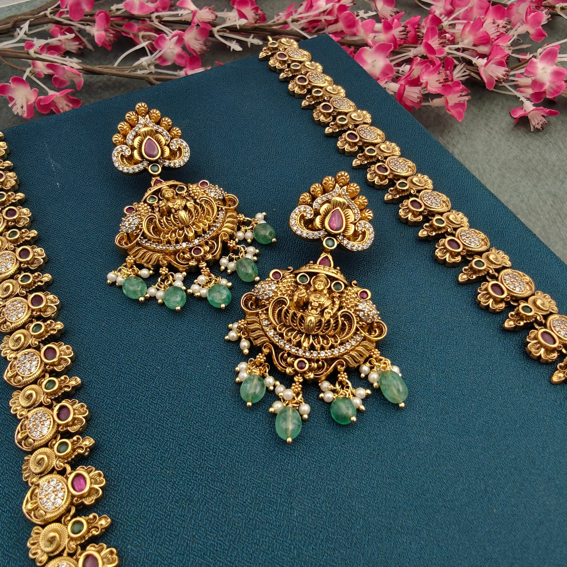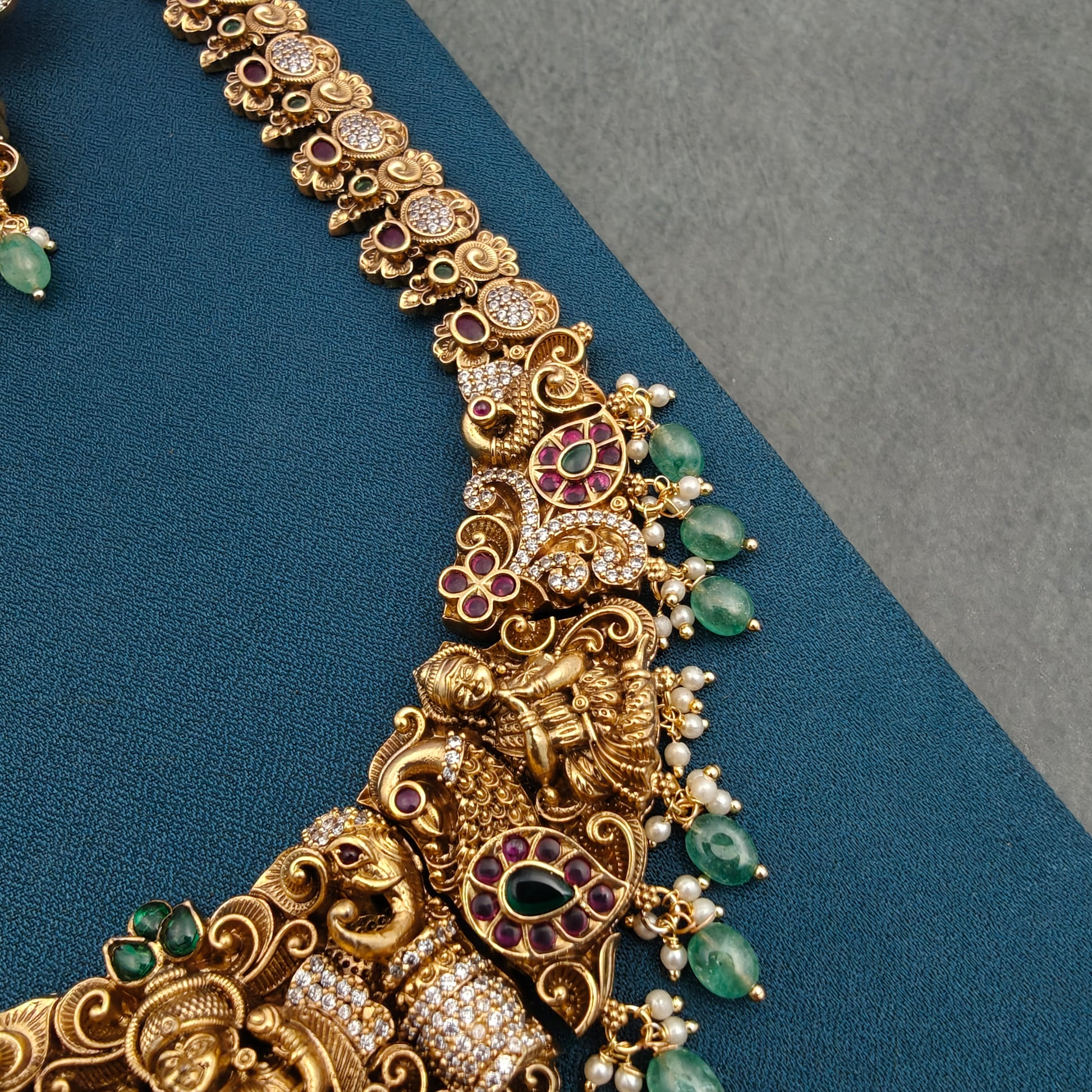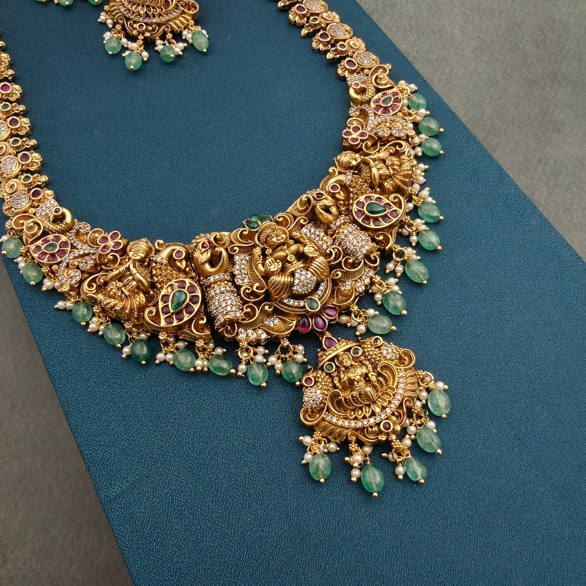 This Gold replica Bridal Traditional haaram features a luxurious combination of green beads and pearls, exquisitely crafted with Nakshi work. Add a touch of royal grandeur to your bridal attire.