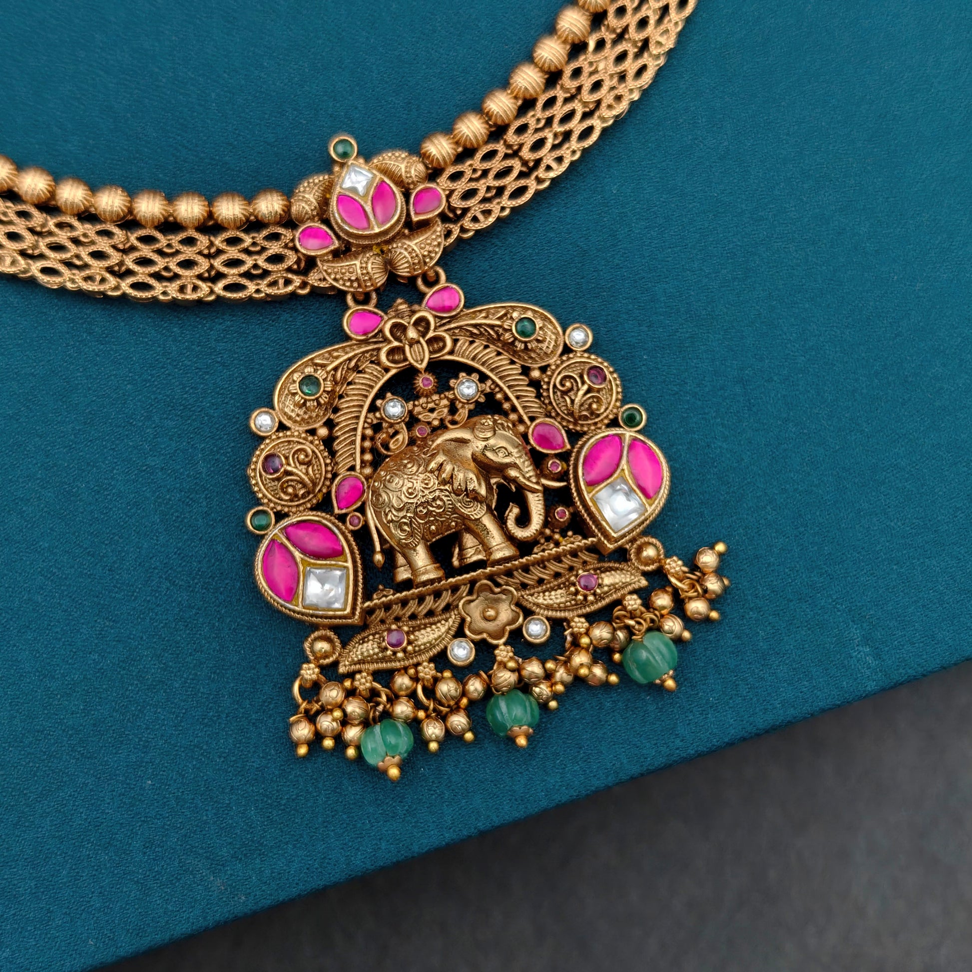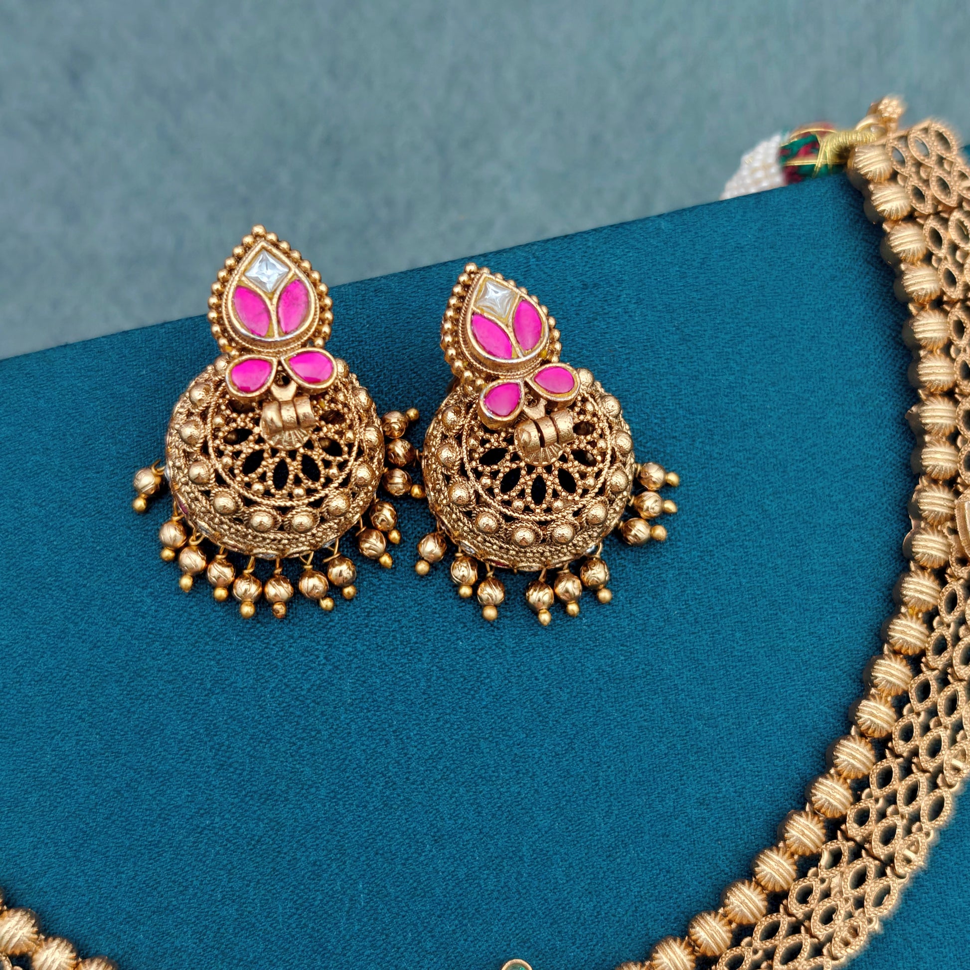 - This no idol necklace Set showcases a gold look traditional antique set in jadau Kundan stones.
