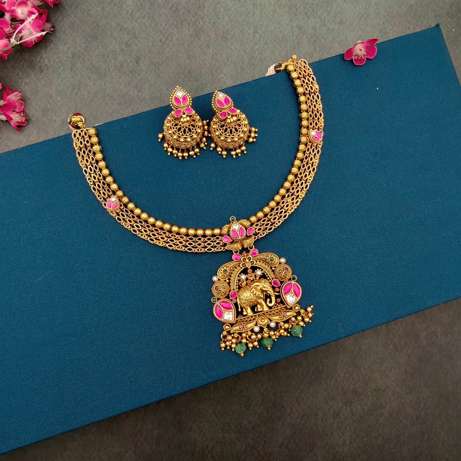 - The set is crafted in a traditional style, often referred to as ethnic jewelry, and has a gold finish.