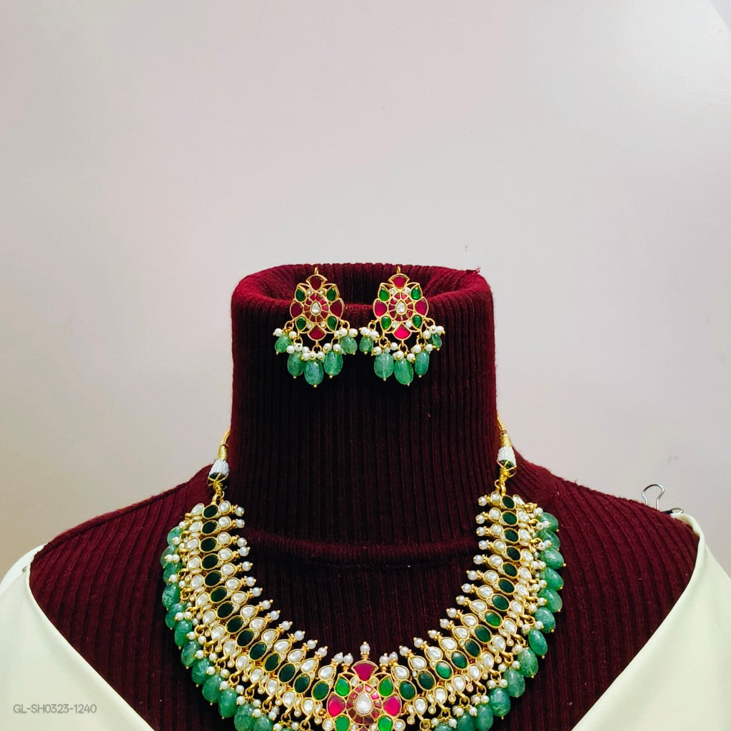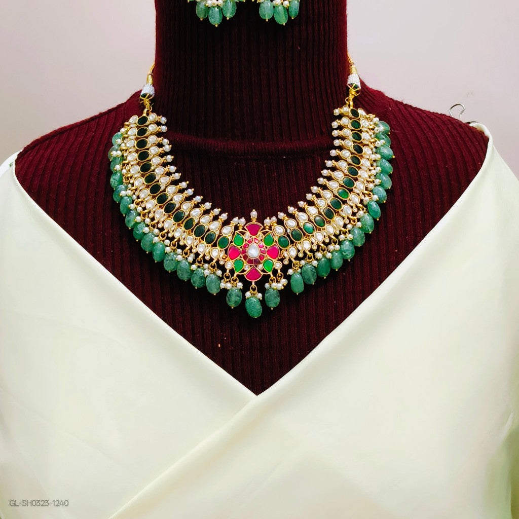 - Elevate your collection with this Jadau Kundan designer necklace set, featuring authentic stones intricately crafted for timeless elegance.