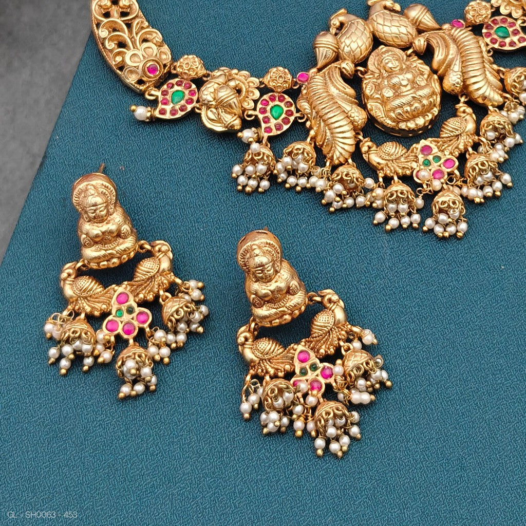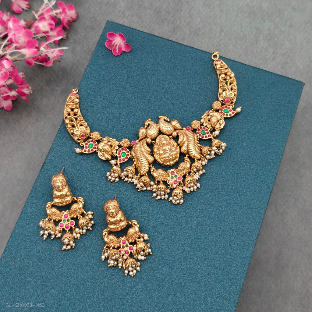 - Expertly-crafted Temple Necklace with a luxurious gold finish featuring exquisite jadau kundan stones and intricate nakshi work, accented by a stunning Lakshmi Peacock charm.