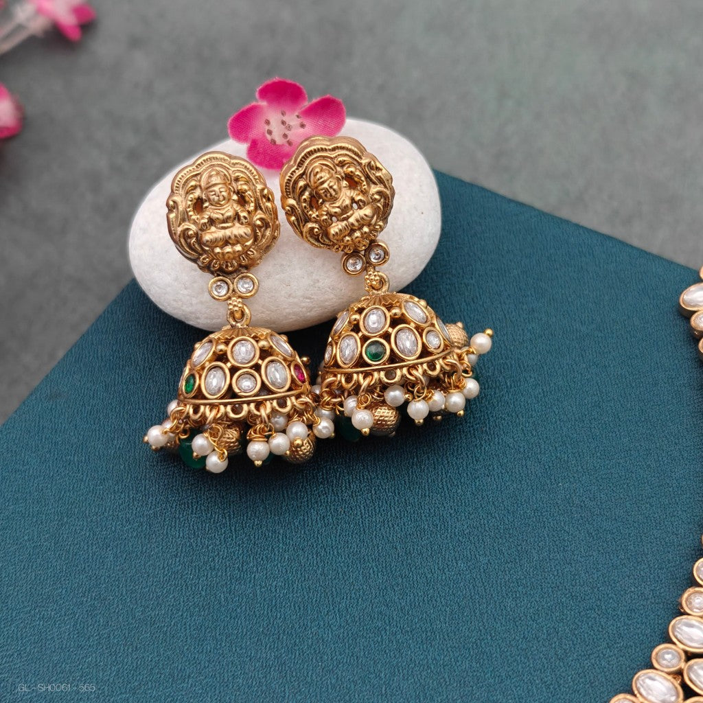 This Gold Finish CZ multicolor Kemp stone studded necklace set features a Lakshmi centerpiece and polki beads, with green beads hanging for a short yet elegant design. The set also includes jhumkas for a complete look.