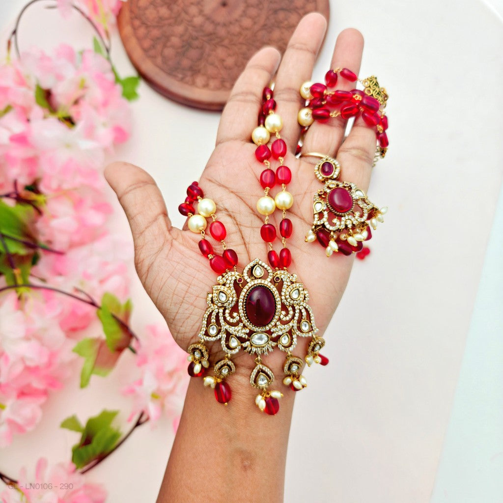 - The pendant and earrings are crafted with a central red stone, surrounded by smaller clear stones and pearls in a Kundan style.