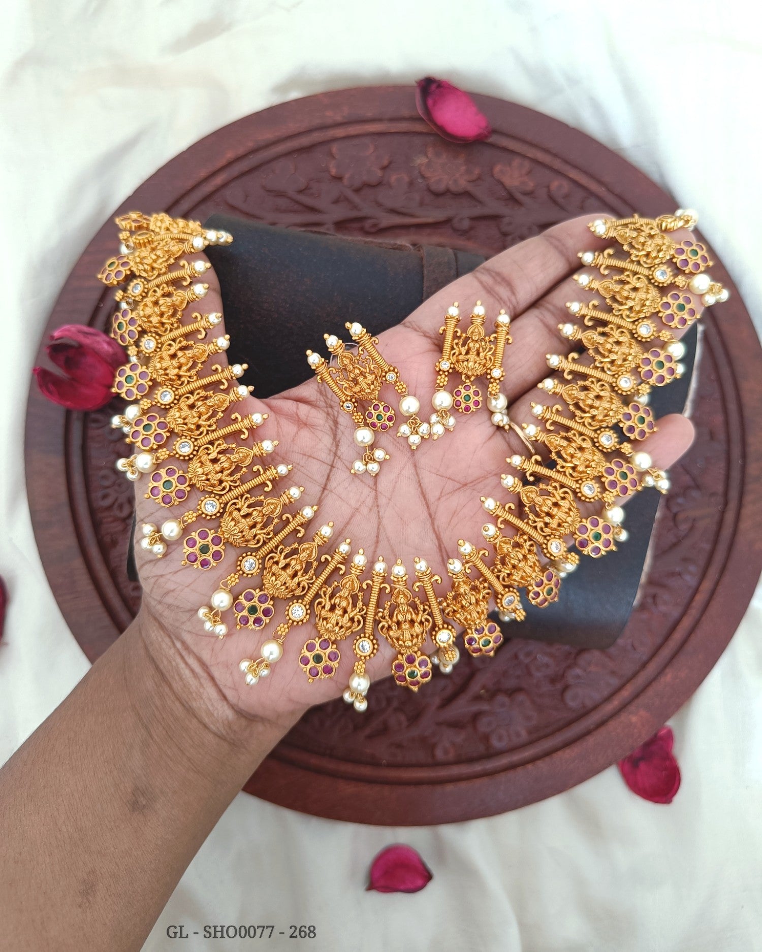 - This necklace features a temple design with Kemp stone detailing, complemented by a matte gold finish and a combination of semiprecious stones and pearls.