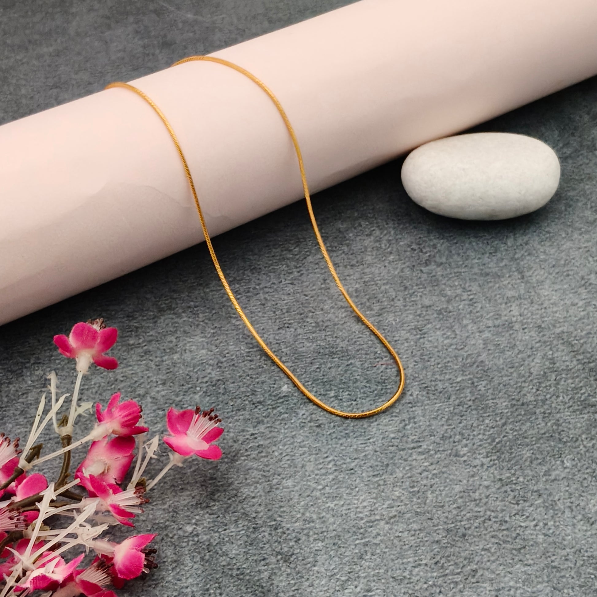 This is a sleek gold-plated snake chain necklace with a smooth, shiny design. It has a simple, elegant look that adds style to any outfit and suits all occasions.