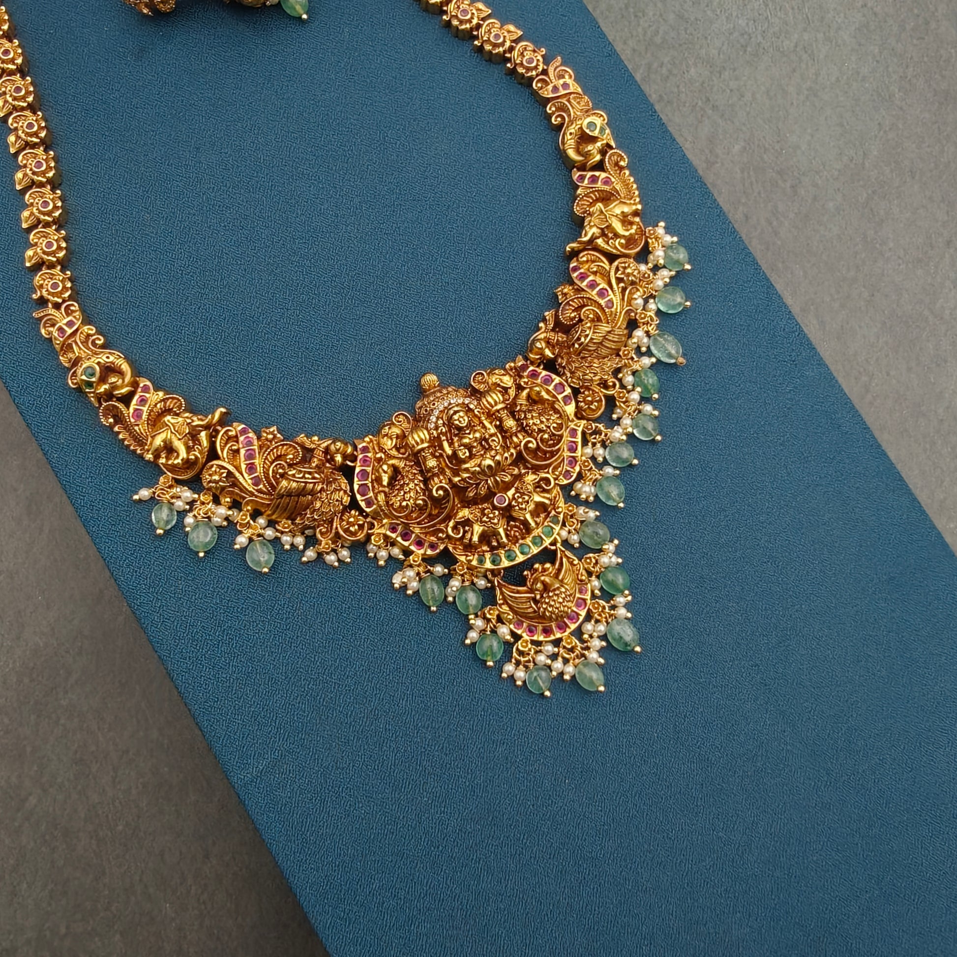 This Gold replica Bridal Traditional haaram features a luxurious combination of green beads and pearls, exquisitely crafted with Nakshi work. Add a touch of royal grandeur to your bridal attire.