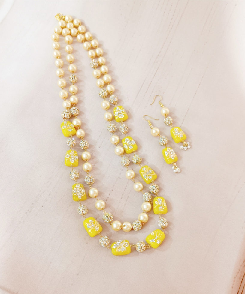 - The set includes a matching pair of earrings, which also feature pearls and the same decorative beads