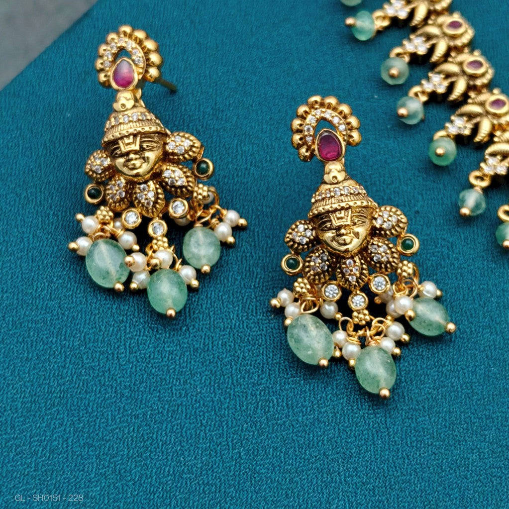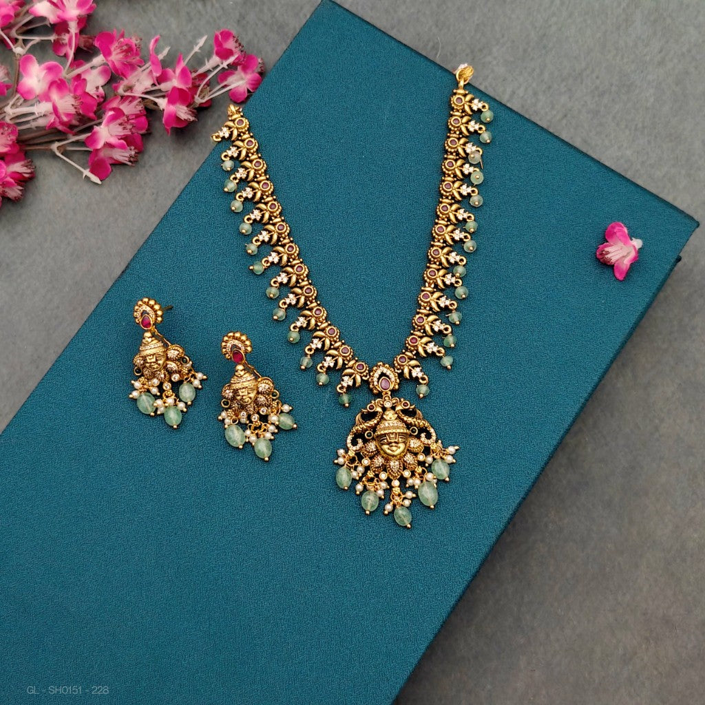 This necklace boasts an antique gold finish and features a multicolor design, showcasing a beautifully crafted Lord Venkateshwara motif. The budget-friendly piece is adorned with green beads, making it a must-have in your jewelry collection.