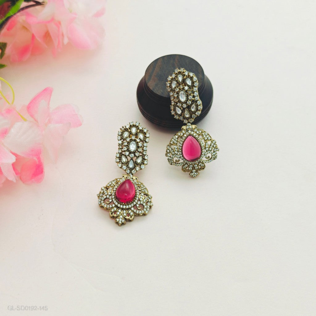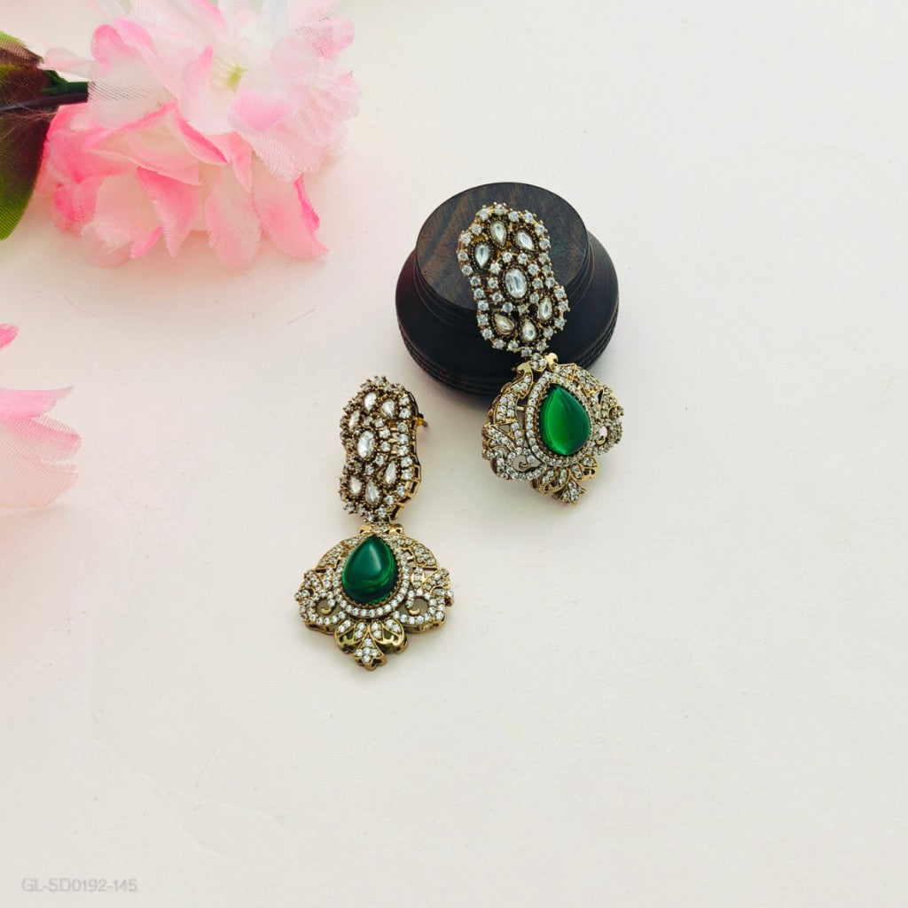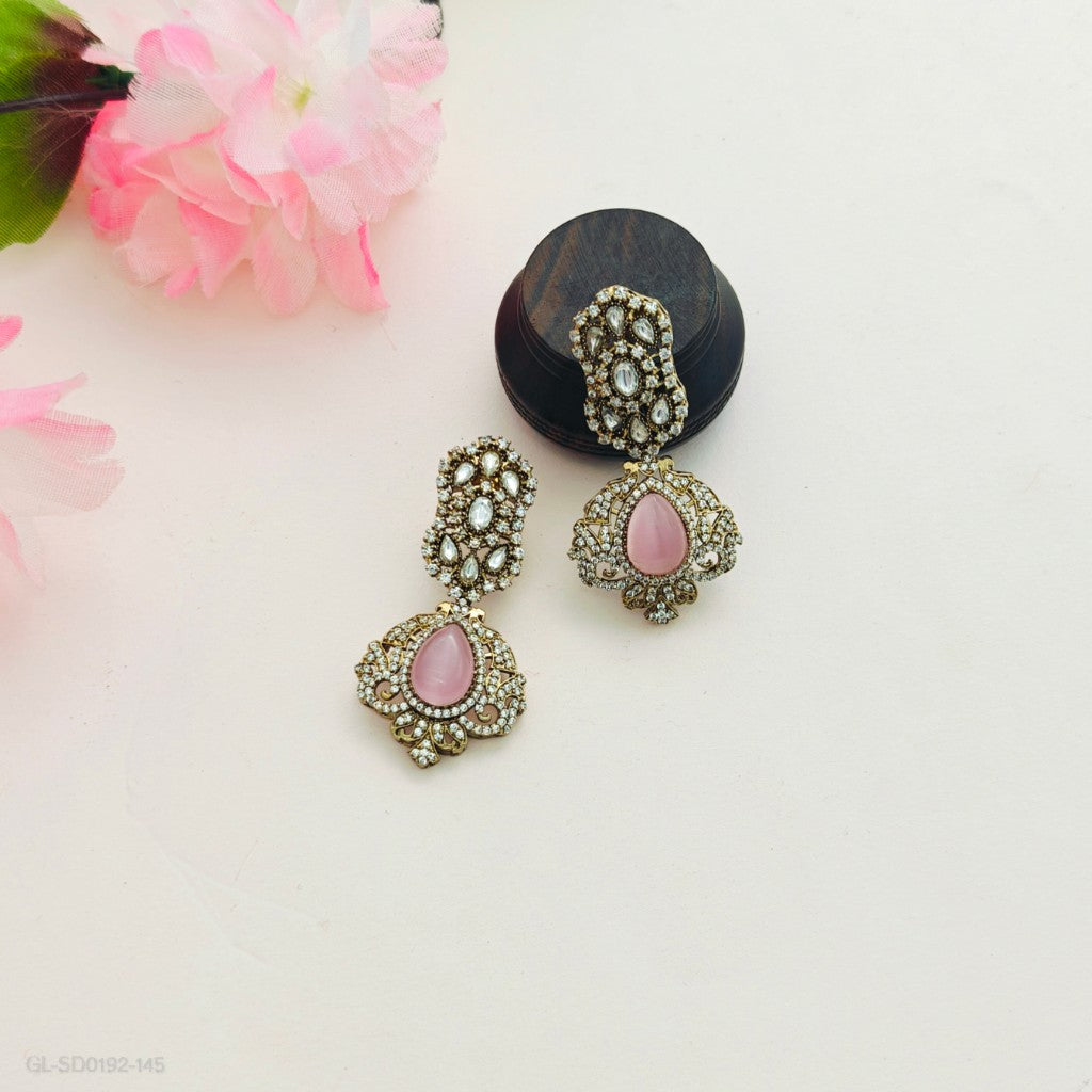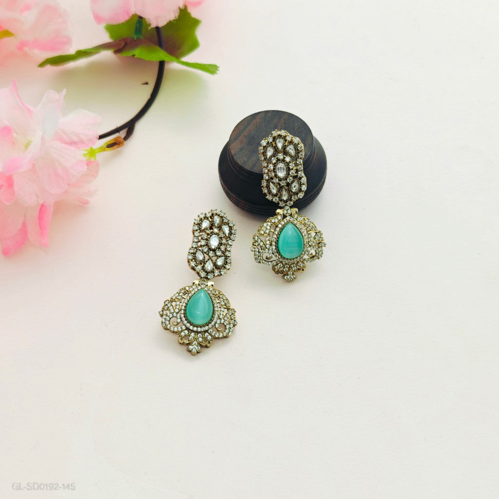 - Each earring is studded with numerous small white stones and a larger, central colored stone, available in shades of blue, pink, and green