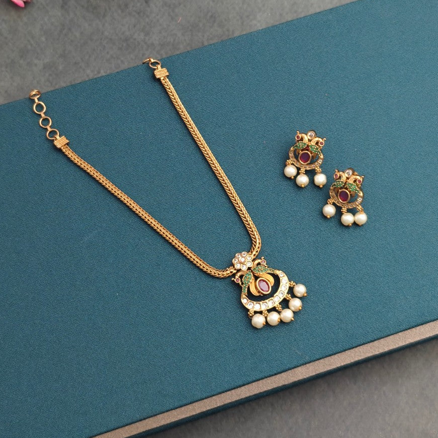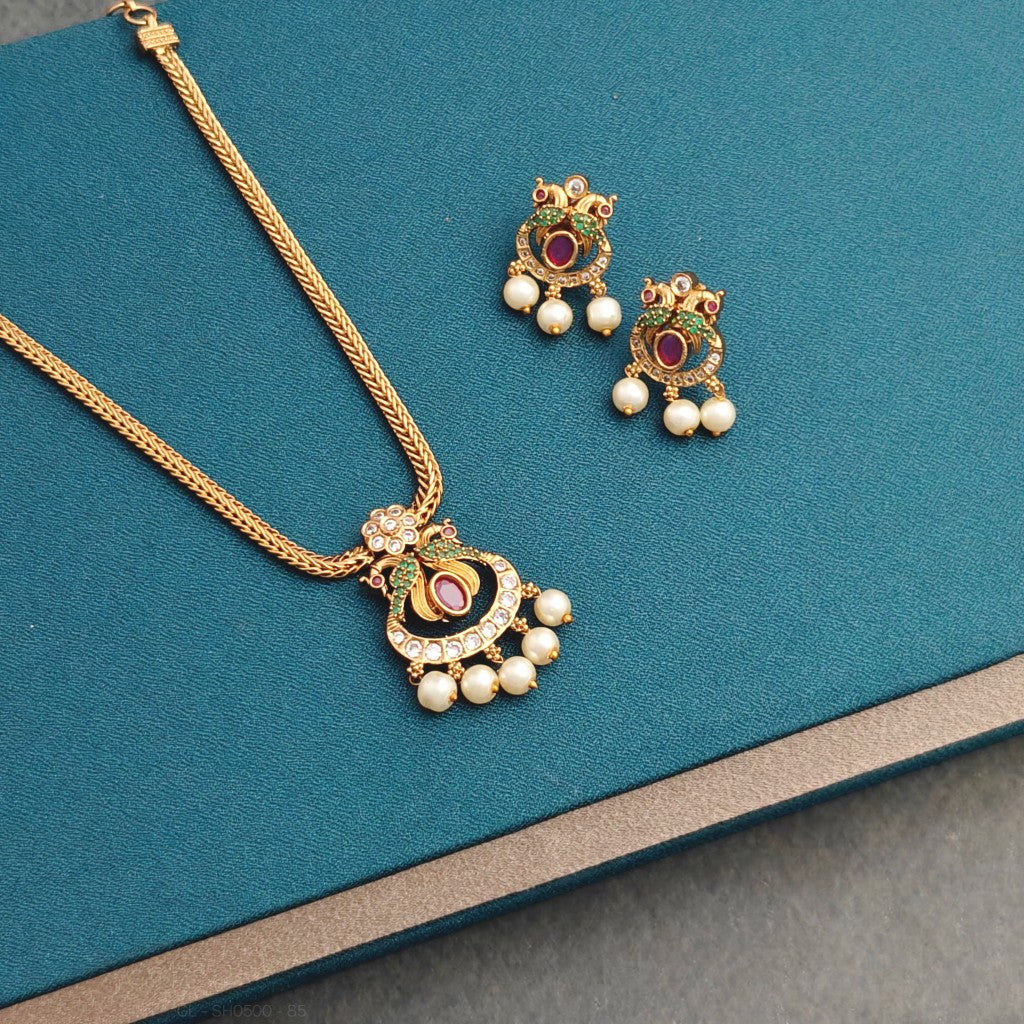A graceful peacock-inspired necklace adorned with rich kemp stones and elegant pearl drops. Perfect for festive sarees, temple wear, and traditional functions. Lightweight, regal, and effortlessly classy.