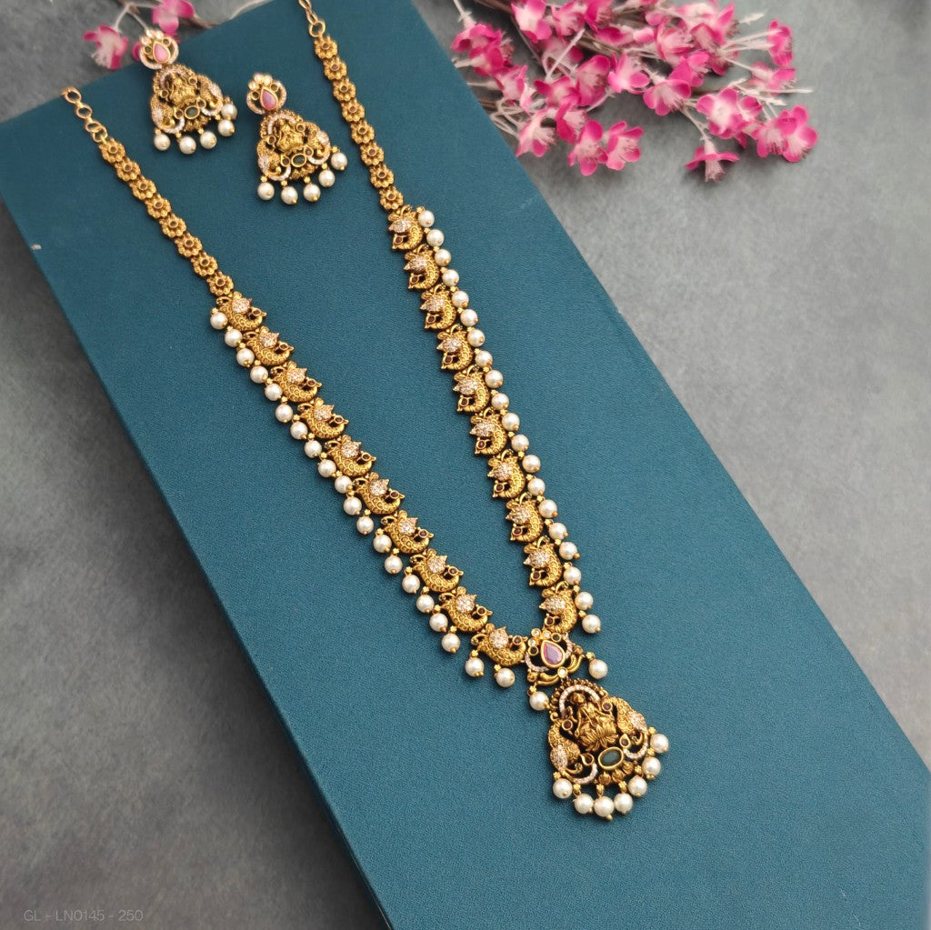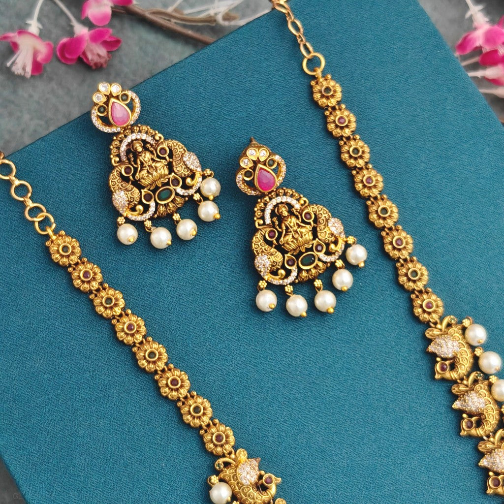 Premium Pearl Temple Necklace Set with Lakshmi pendant.