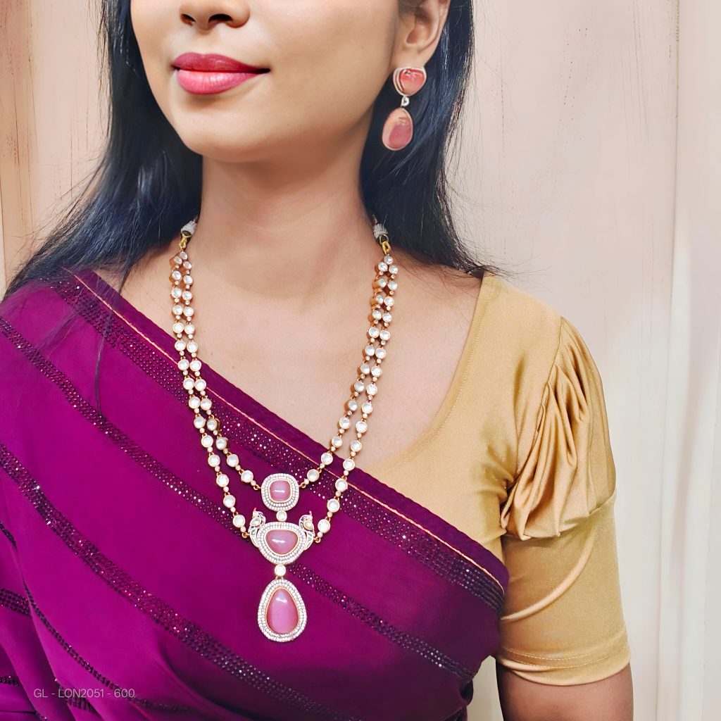 Expertly crafted with a Mossanaite doublet stone, this mid-length necklace showcases delicate green beads and is perfect for any bridal ensemble. Its eye-catching design is complemented by long white and green stone earrings for a sophisticated touch.