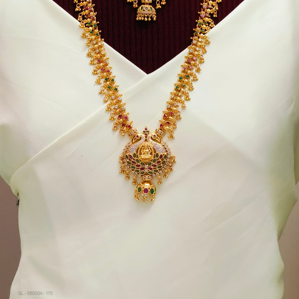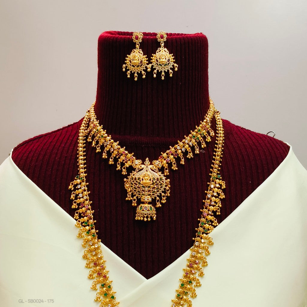 Introducing the Gold finish lakshmi peacock design with Ruby and emerald stone Combo Set .This sophisticated set includes a short and long necklace without earrings
