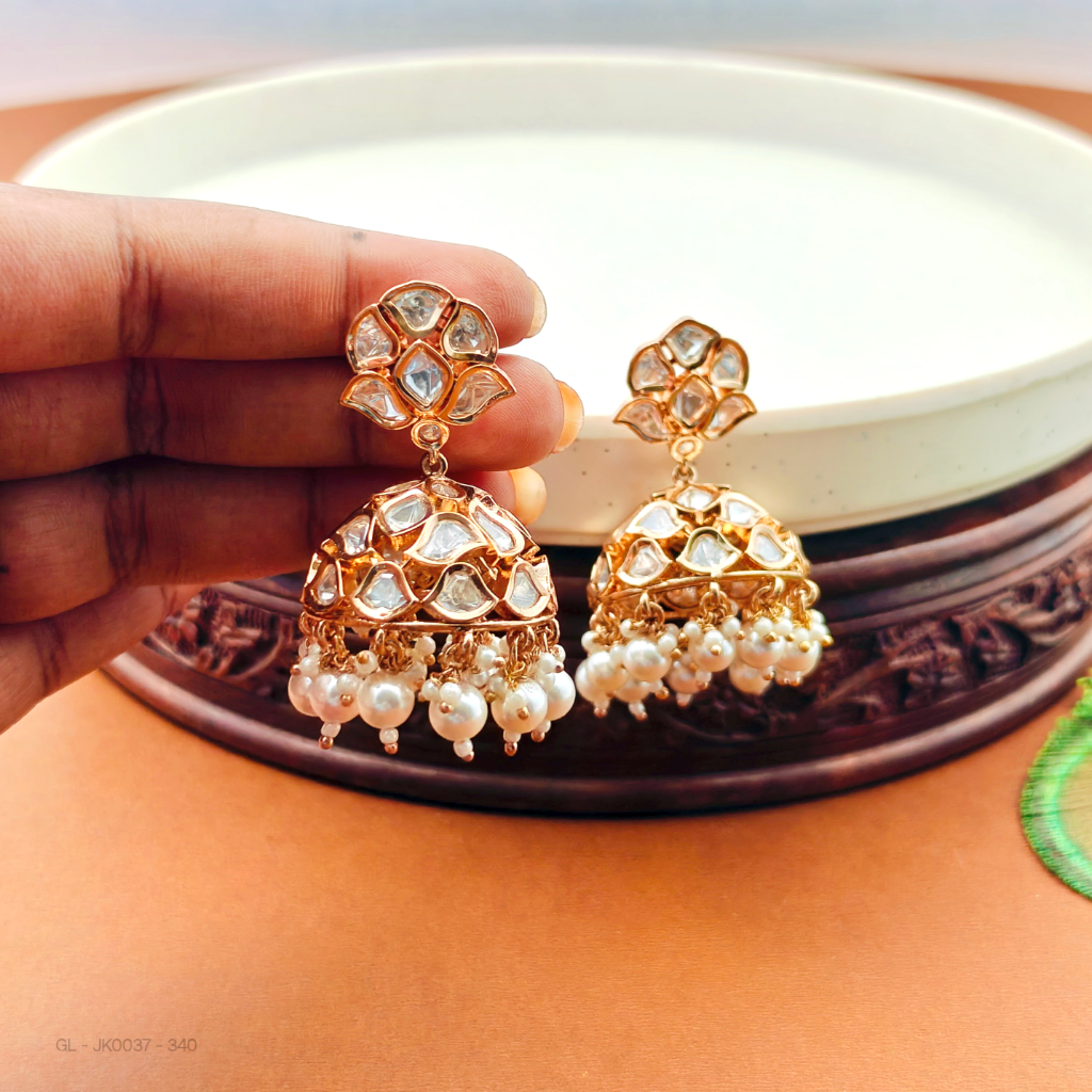 - Handcrafted with real semiprecious polki and kundan stones, these Jhumkas are inspired by celebrity fashion for a regal and sophisticated look.