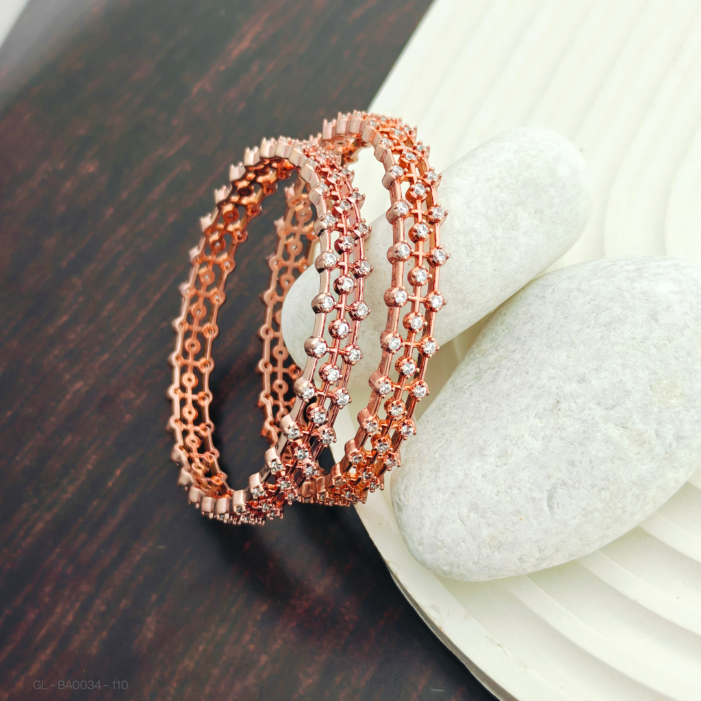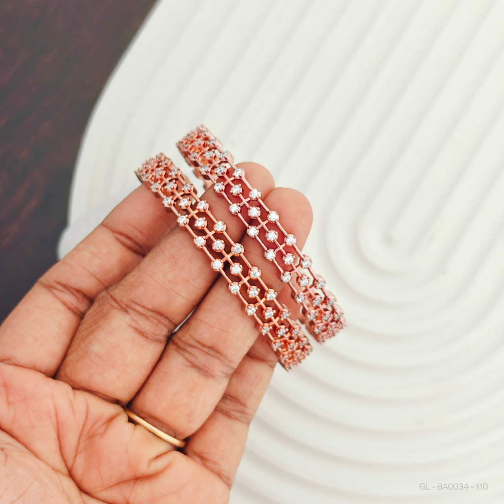 - This 2-piece set, features a rose gold finish and is adorned with AD stones, making it a must-have for any jewelry enthusiast.