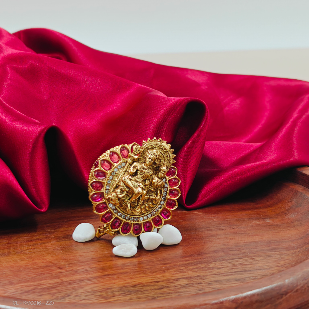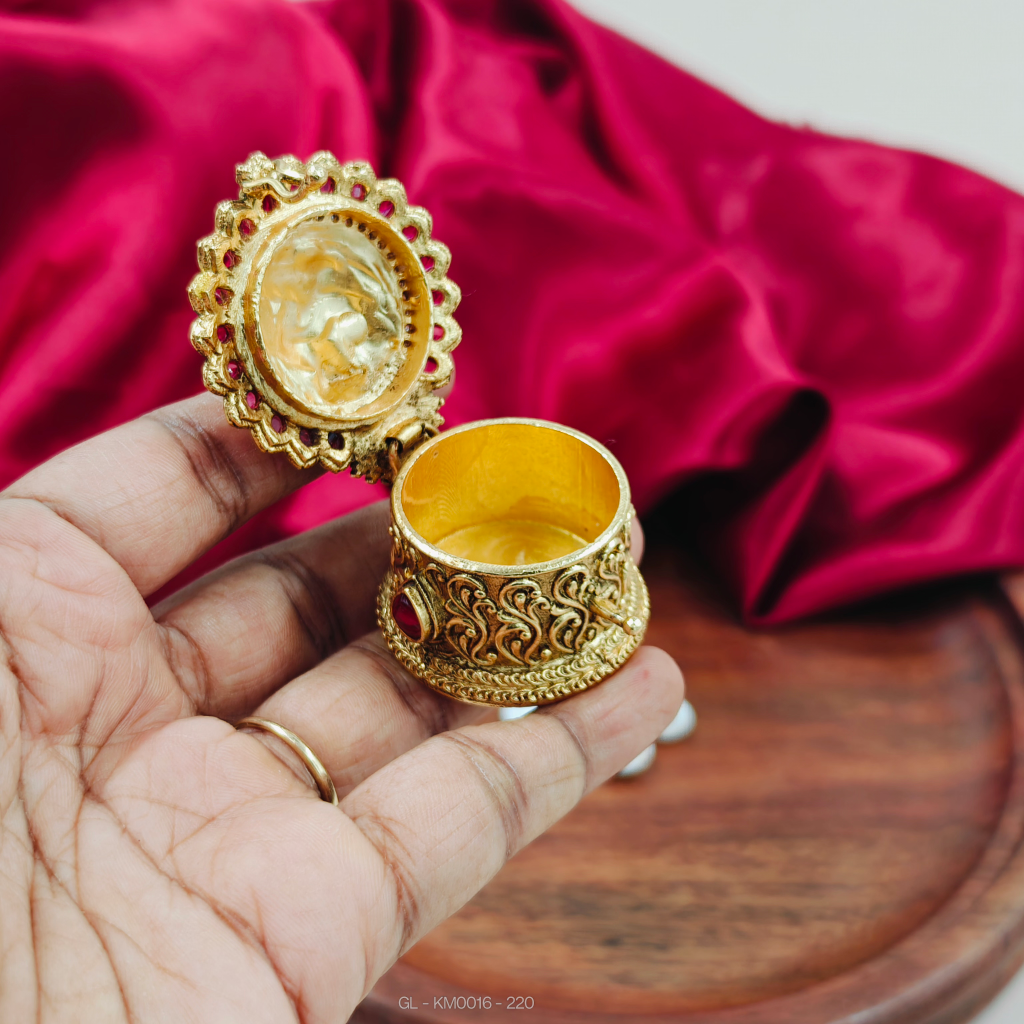 - This shiv-parvathi kumkum container is crafted from gold-toned metal and adorned with pink  stones. Designed for traditional or pooja use, it provides an elegant and secure place to store kumkum powder.