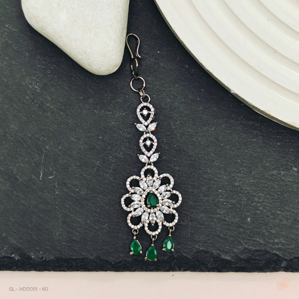 - The Tikka Head Accessory features a carefully crafted design, incorporating kemp stones, pearls, and a gold finish.