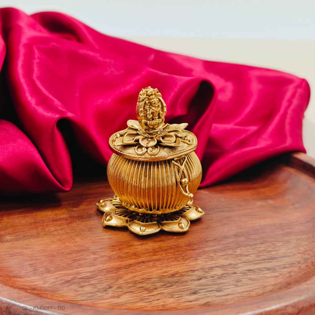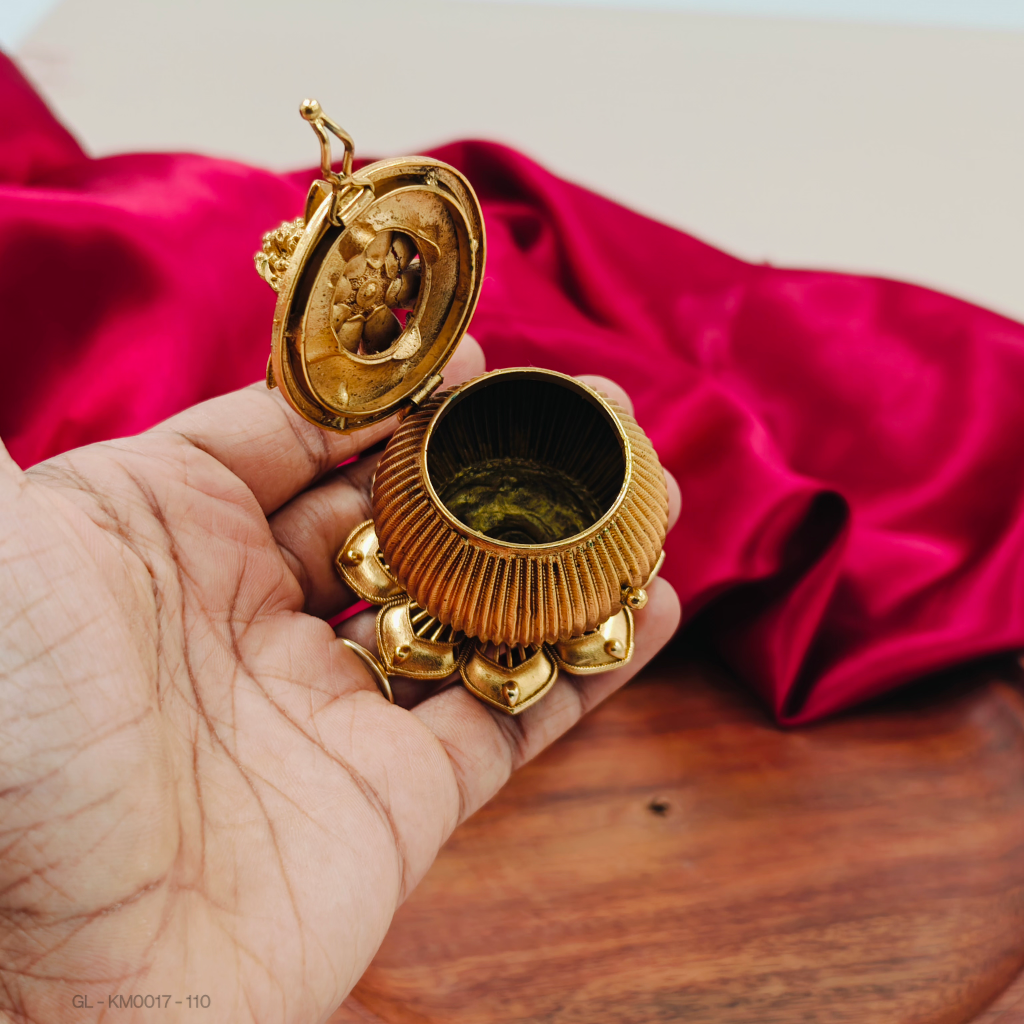- This traditional kumkum container is crafted from gold-toned metal . Designed for traditional or pooja use, it provides an elegant and secure place to store kumkum powder.