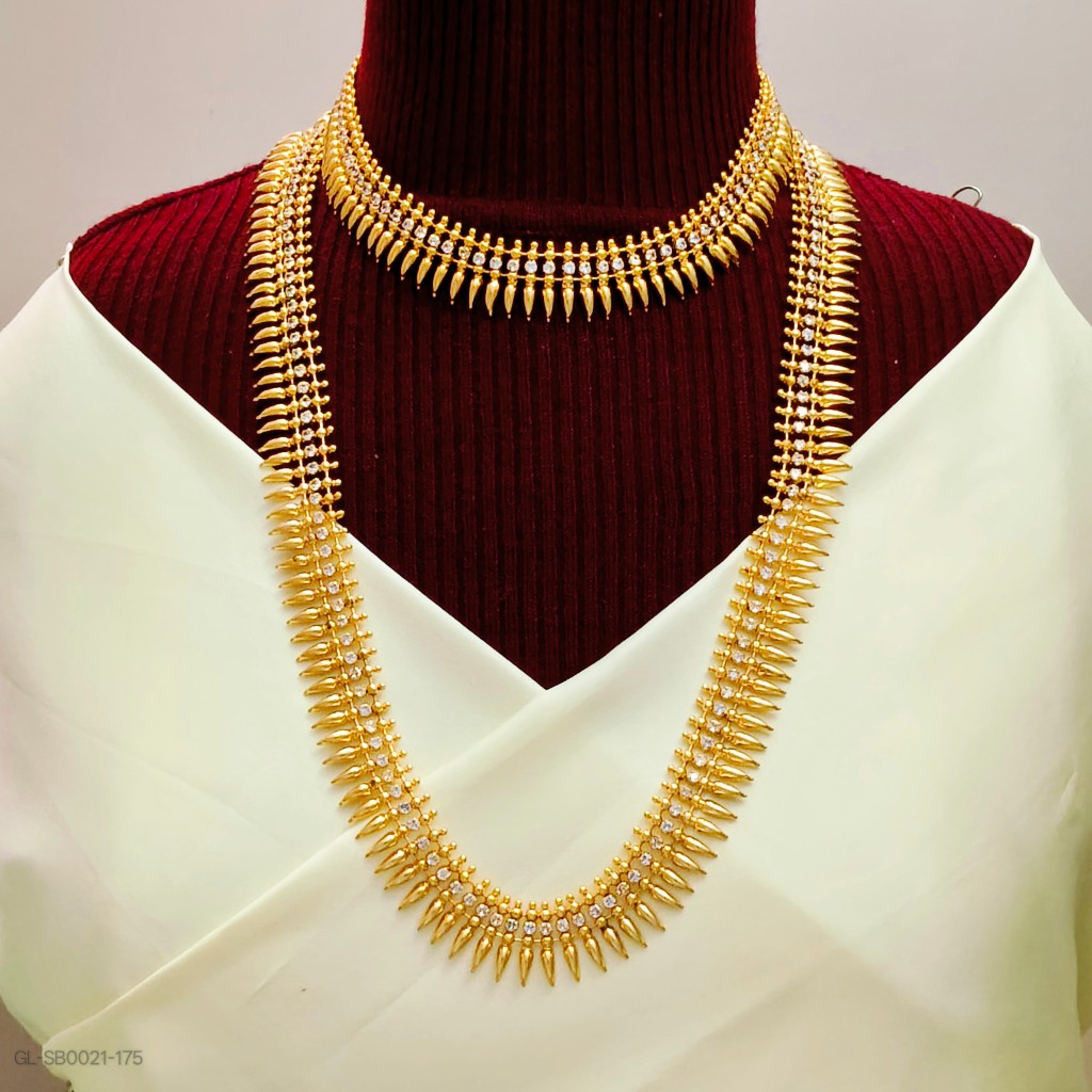 Introducing the Gold finish mullai Mottu alligned Combo Set, featuring the elegant kerala style. This sophisticated set includes a short and long necklace without earrings