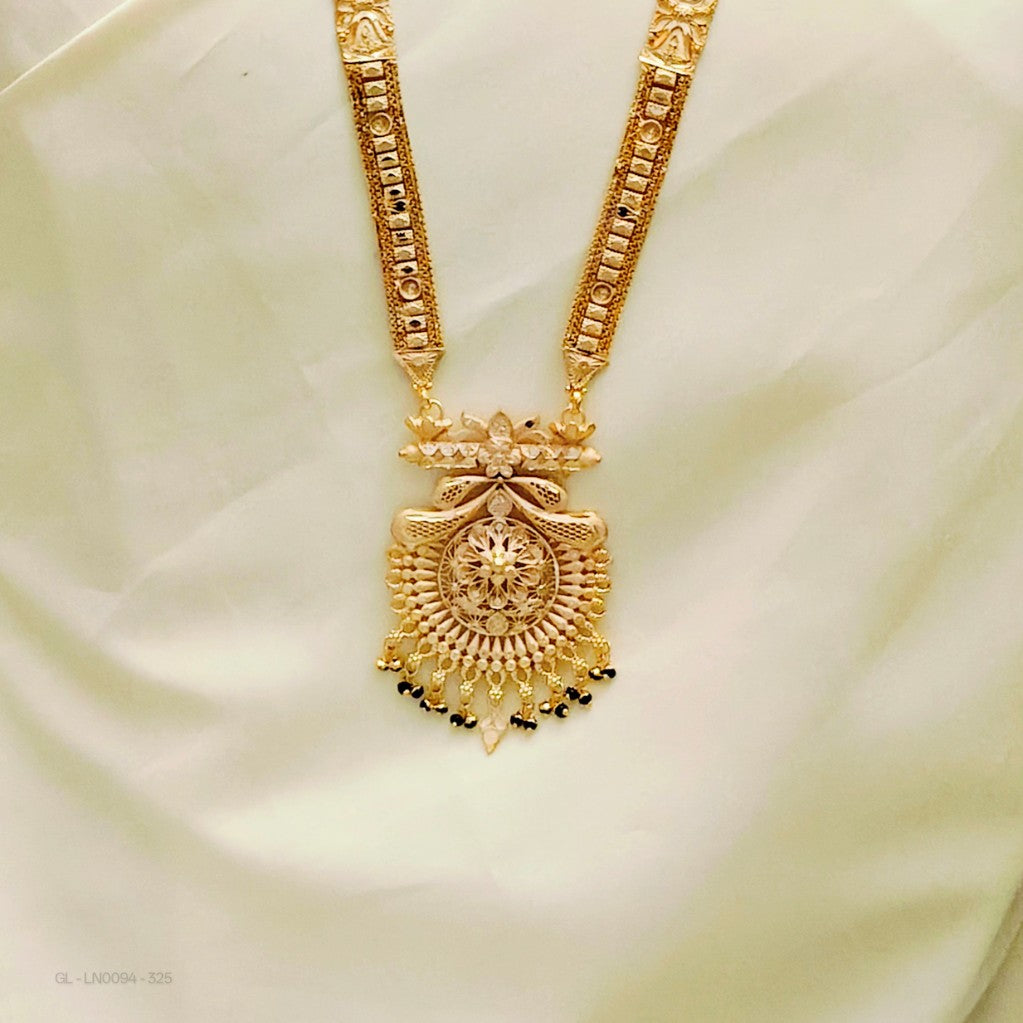 - A traditional South Indian gold necklace featuring an ornate pendant with intricate filigree work and floral motifs.