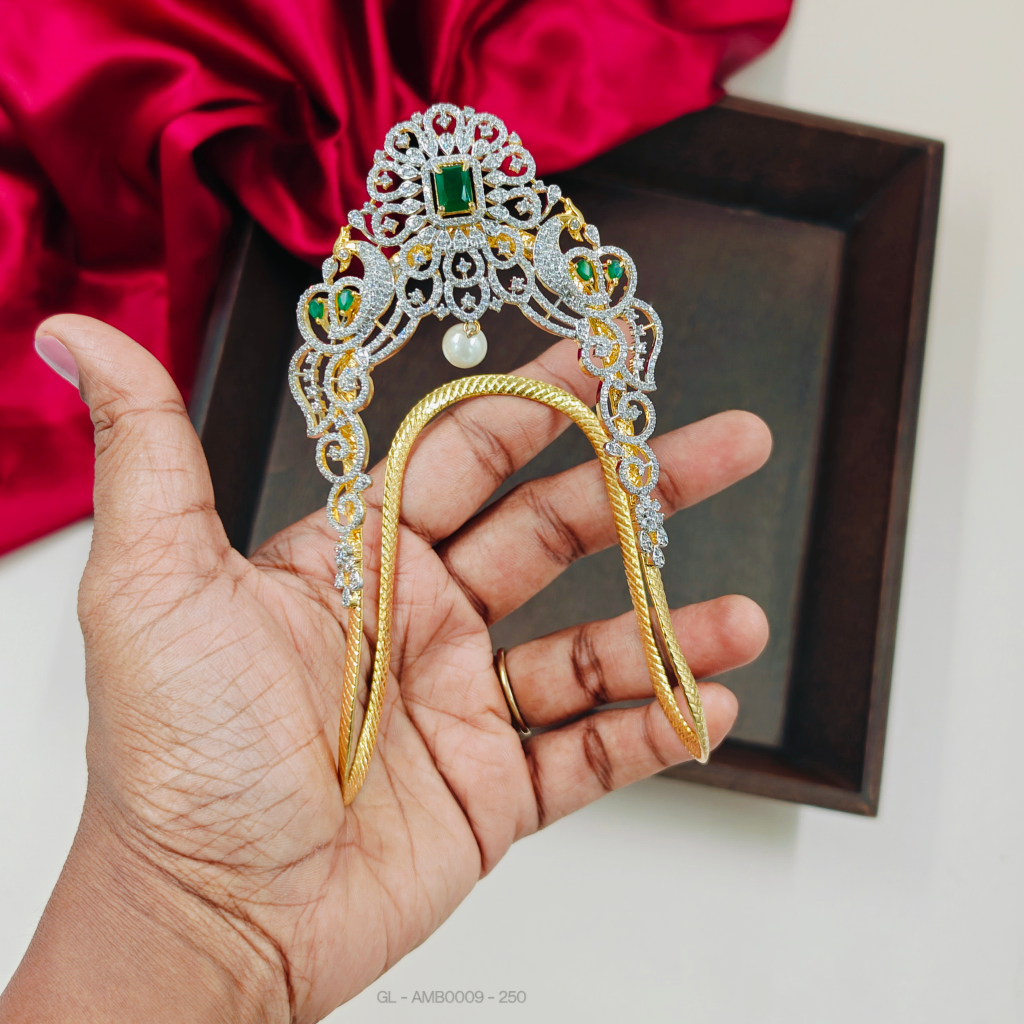 - This Nakshi armlet for women showcases traditional design with Green stones and white pearl perfect for enhancing your look at festivals and weddings.